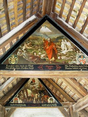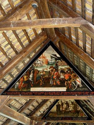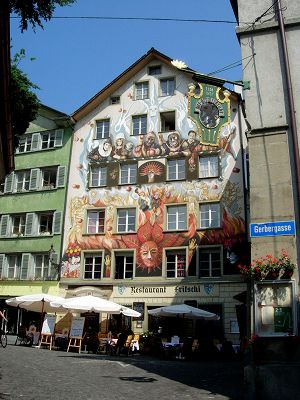 カペル橋は14世紀前半に街の要塞として建てられた屋根付きの木造 梁に飾られた板絵はスイスと