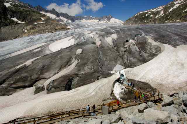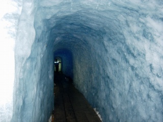 駐車場から階段を少し上がったドライブインで入観料を払い 板橋を渡り氷河をくり抜いたトンネルに入る、中は青白く幻想的雰囲気だ、また氷河の上を歩いている観光客も居て怖そうだ!”この融けた水がローヌ川の源流となり、ジュネーブのレマン湖にそそぎ、やがて地中海へ流れる。