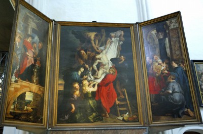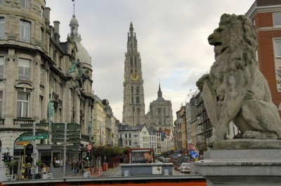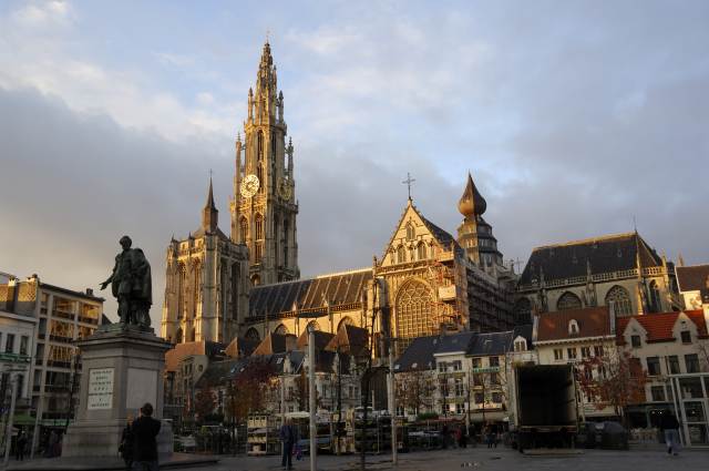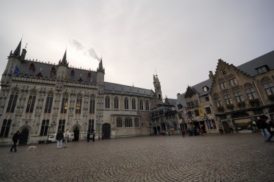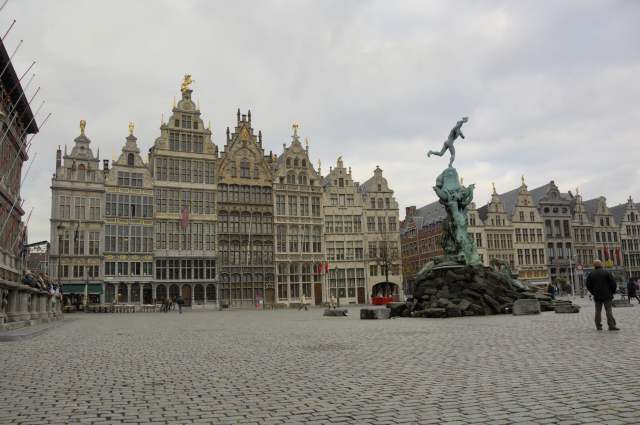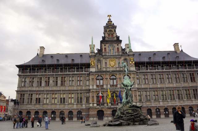 ルネッサンス建築の市庁舎 前にブラボウの噴水がある 広角レンズで。下の写真は右横の建物
