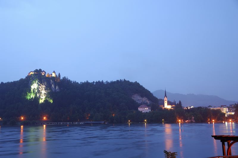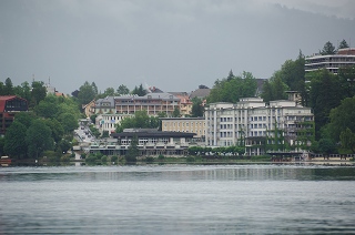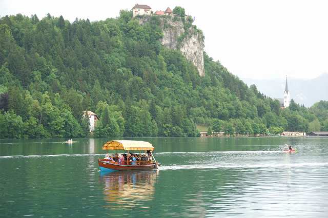 | ブレット湖の湖畔のホテルに宿泊 到着時は雨であった。 山の緑を映し出す水面は青く輝きその周りに古城、小さな教会などが彩りを添えているスロベニア屈指の保養地でもある、ホテルの前の断崖に建つブレット城、・湖上の小島にバロック様式の聖マリア教会があり翌日小雨のなかボートで渡った、船上からの景観は一幅の絵のようだ。 |