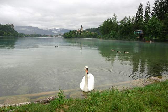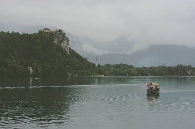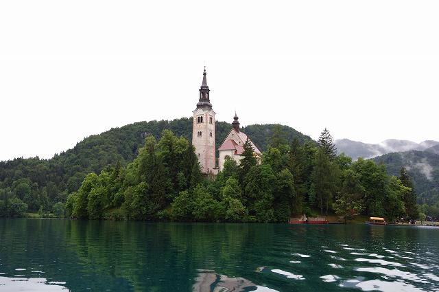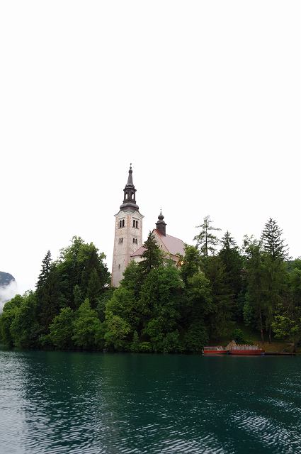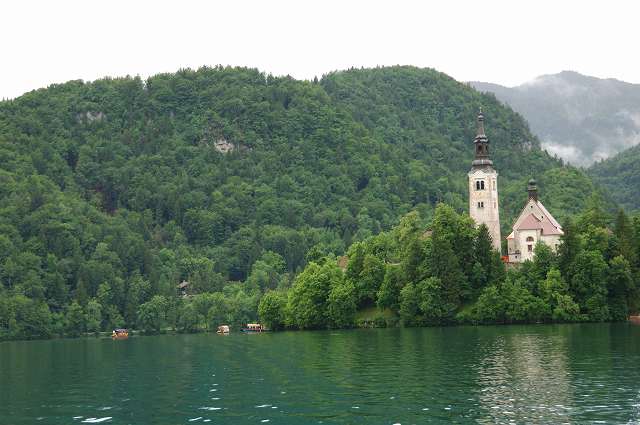 | スロベニアの首都リュブリャーナを見るとオーストリアの地方都市のように感じると思うが、第一次世界大戦後、ユーゴスラビアが作られるまでスロベニアはオーストリア領でだった、とりわけブレッド湖はオーストリアにあっても何ら不思議ではない風景だ。小さな湖に島が浮かび、背後にはユリアンアルプスが控え、まるで絵画のような美しい風景が広がっている今日は小雨で霧のユリアンアルプスが幻想的に観える。 |