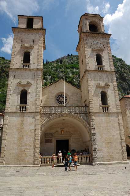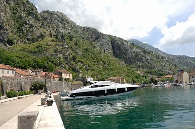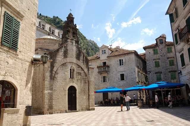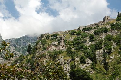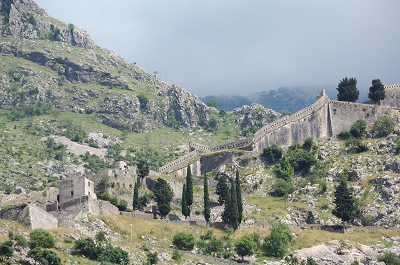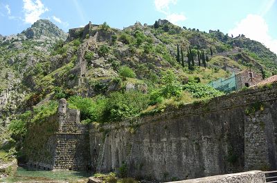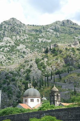 | コトルはローマ都市アスクリビウムとして始まり、ビザンツ帝国、ハンガリー王国に支配されながらも一定の自治を保って繁栄しました。14世紀にセルビア王国のもと最盛期を迎えるも、やがてヴェネツィアの支配を受け、アドリア海の前線基地が置かれました。コトル湾に面した街は、周囲をすべて岩山に囲まれています。こうした地形に堅く守られているため、トルコ軍や海賊を撃退してコトルは栄えることができたのです。 街並みだけならクロアチアのドブロブニクに負けますが、コトルですごいのが背後の山に沿って築かれた城壁。銃眼がついた石造りの壁が、はるかな高みまで続いています。恐らく住民は町が襲撃を受けても、この山に立てこもって敵に向かうことができたのでしょう。上って行くとコトルと周辺の街、コトル湾が一望のもと。入り江があまりに深いので、いくら上っても外海は全く見えません。眼下に横たわる海が、まるで湖のように思えてしまいます |