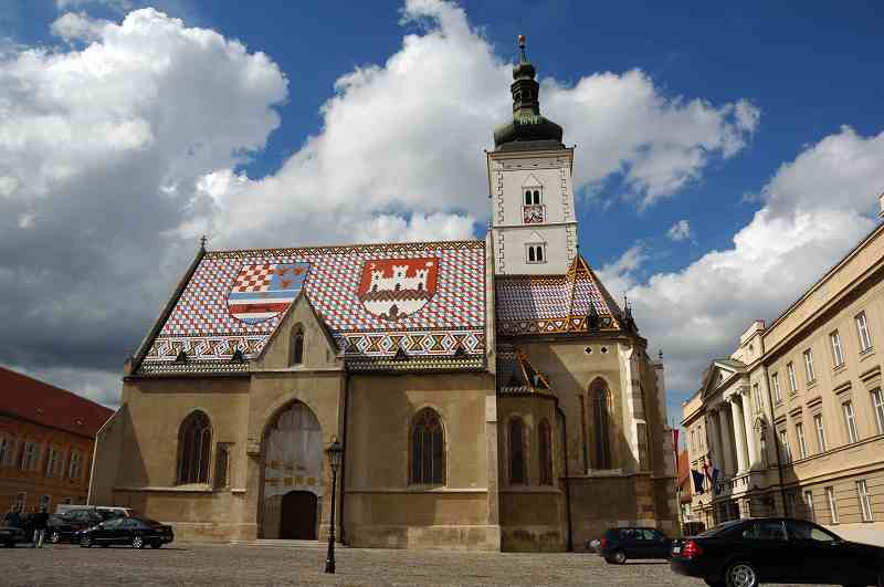 | 13世紀にゴシック様式で建てられ、18世紀に再建されて現在の形になった。1880年に造られたモザイクの屋根が特徴的。 3つの紋章がひとつになっているのがクロアチア王国の紋章右の城が描かれているのがザグレブ市の紋章です。 |