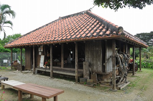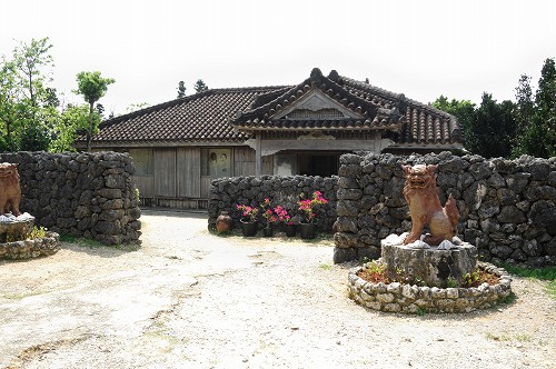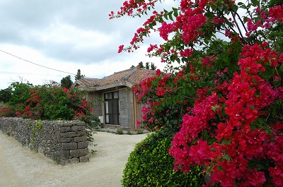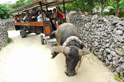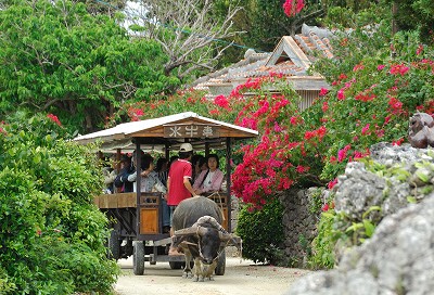 水牛車に乗って島内の赤がわら屋根の集落、珊瑚の石垣塀など町並み散策