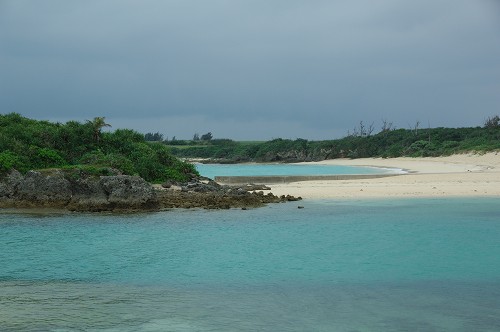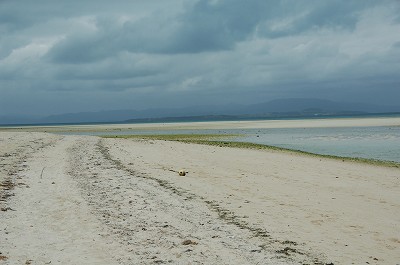 長さ800m、幅50mにわたって真っ白な砂浜が広がる、伊良部島の代表的な海水浴場です。細かい白砂と青い空、それに緑色の海が鮮明です。