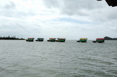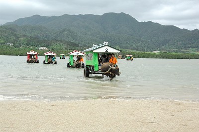 水牛使いのおじさんが三線を引きながら島唄を唄って遠浅の海を由布島までゆっくりと進む周りの景色とマッチして情緒ある光景だ