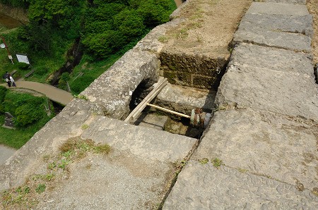 通潤橋は人を渡す橋ではなく、橋の上に石造パイプを3列並べた通水管を通し、水を渡す水路橋である。水路は水の吹上口が取入口より約6m低くなり逆サイホンとも呼ばれる連通管によって対岸に水を送る特異な構造になっている。アーチ橋自体の技術史上、また文化史上貴重な遺構、極めて重要な建造物と認められ、昭和35年2月9日に文化財保護法の規定により、国の重要文化財にも指定されている。 |
