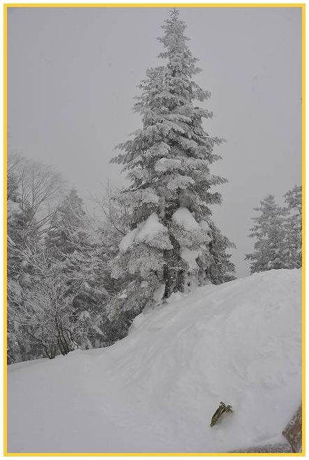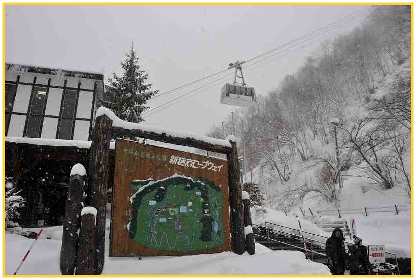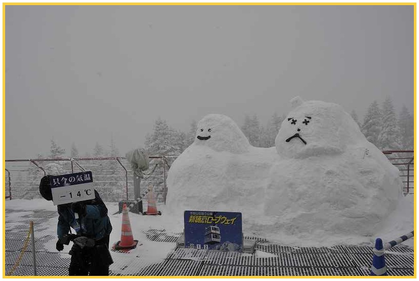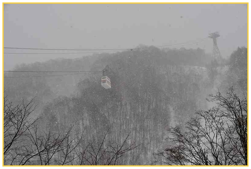 新穂高ロープウェイで槍・穂高に一番近い展望台まで行くのに、途中鍋平高原(1305m)まで行きのりかえ徒歩4分でしらかば平ロープウェイ駅から西穂高口(2156m)まで7分・晴れていれば冬の絶景穂高連峰の眺望が満喫出来たのだが生憎悪天候で視界ゼロ