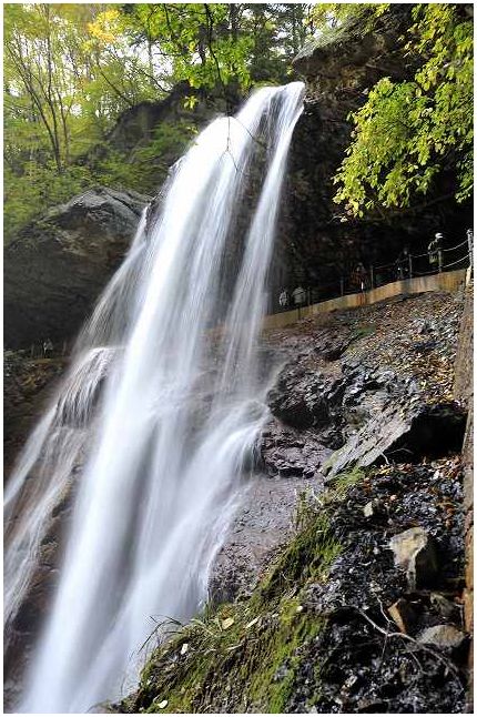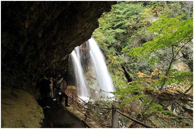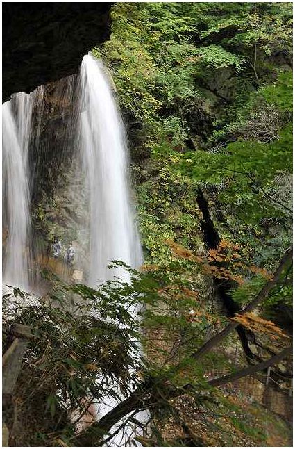 雷鳴のごとく豪快な流れの雷滝、滝の裏側からも見られ裏見の滝とも言われています
