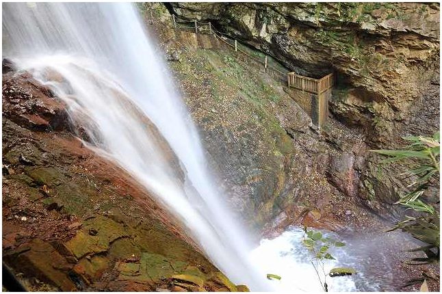 滝の裏側を通り展望台まで階段を降りる、豪快だ!