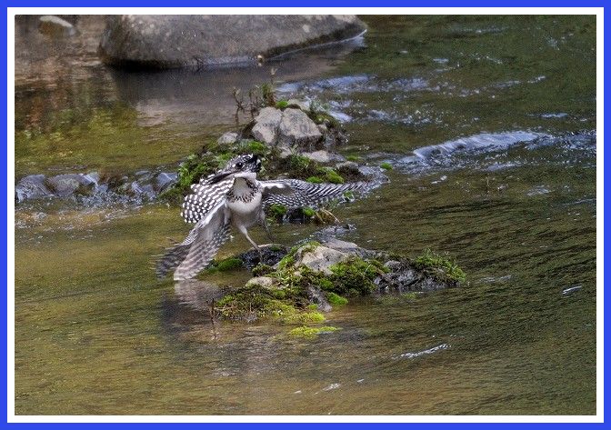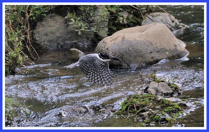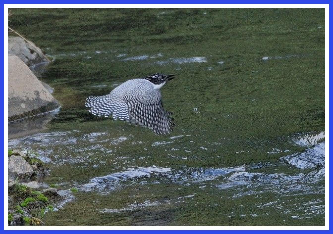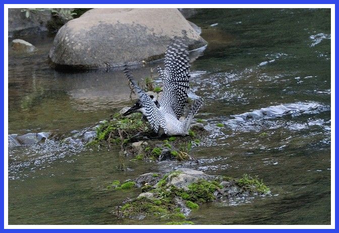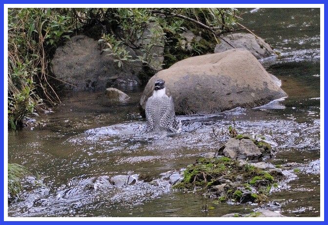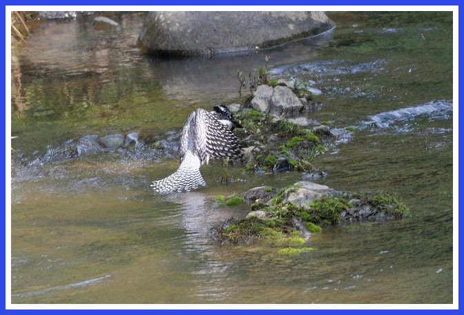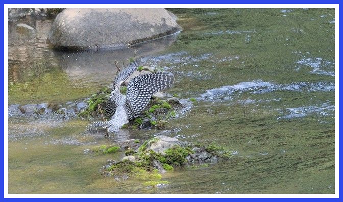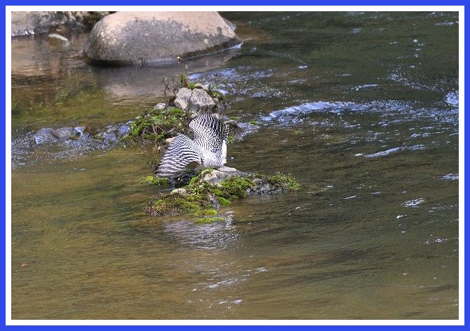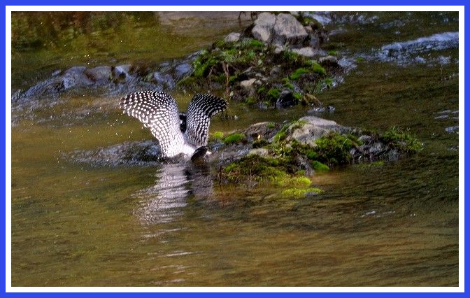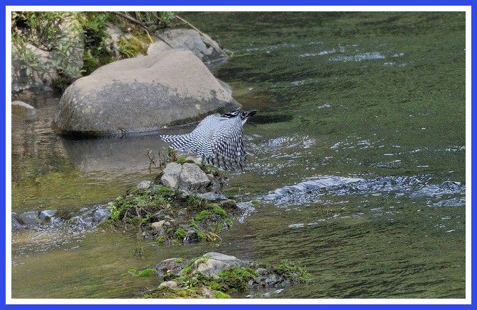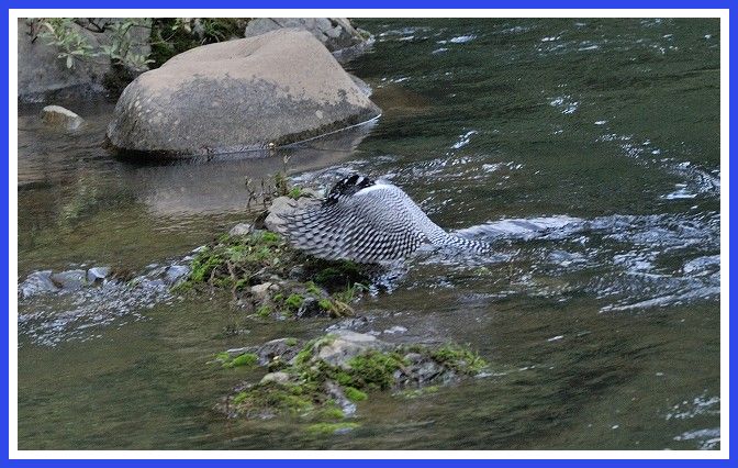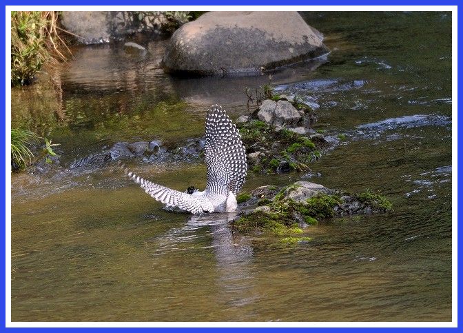 白黒のまだら模様(鹿の子)の羽色は木陰や広葉樹・雪景色の渓流に溶け込み気品と勇姿が