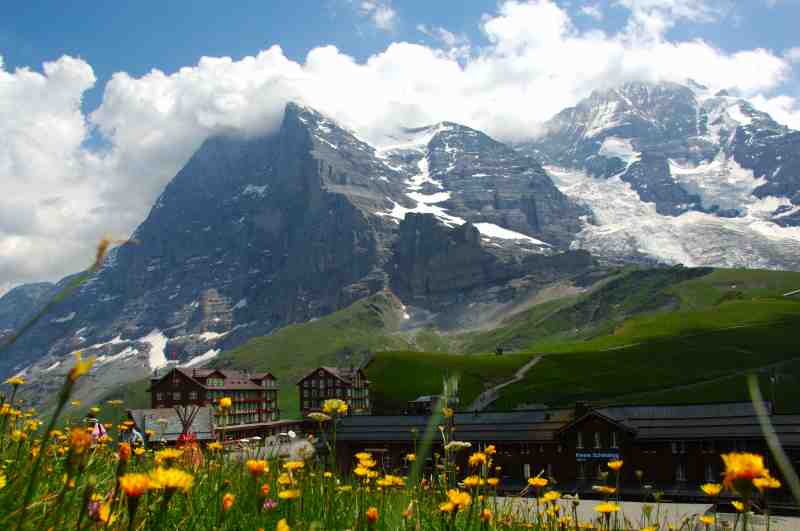 クライネシャイデックから目前に迫る左からアイガー、メンヒ、ユングフラウ