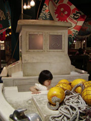 中央の広場には漁船の模型がドンと置いてありました。 船のエンジン音もしっかり出るすぐれもの。 ゆんが立っているあたりにスロットルがあって、 スピードを上げる方に倒すとちゃんとエンジン音が上がるんです(笑)。 |