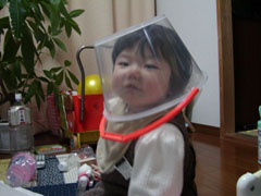 バケツかぶると、ロボットみたいだね。 |