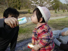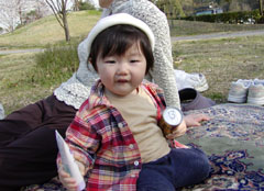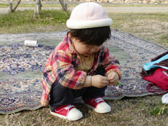 別の広い公園にて。 手にもっているのはコーヒー缶と、なぜかハンドクリーム。 ビニール製のチューブがいいみたい(笑)。 |
