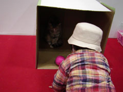 箱の中に潜入。 果たして気になるのは、奥にいる猫か。 それとも手前のボールなのか(笑)。 |