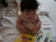 | 絵本、大好き。 これはボタンを押すと出てくる動物の声が聞こえるもの。 足をぱったぱったさせて喜んでいます。 |