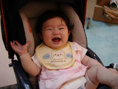 | スーパーの休憩所にて。 結構ぐずらずにベビーカーにのっていますが、 こんな風にお父さんやお母さんに構ってもらえると大喜び。 きゃーきゃー言うと共に、こっちもあんよが(笑)。 ちょっとえらそうに座ってます(爆笑)。 |