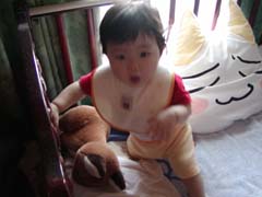 | またまたカメラを見つけると、少々の障害は乗り越えてきます。 大好きなぬいぐるみのクッションで遊んでいたのですが、 「うーうー」と言いながら近寄ろうとしてます。 |