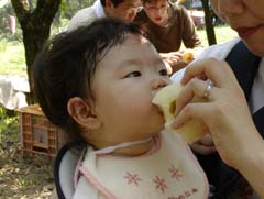 | 梨狩りにて。 この日はとっても暑く、大人もゆんも汗だく。 そんな日は梨は冷えてなくてもとっても美味しく感じます。 お母さんの食べている梨が欲しくって、思わずぱくっ。 しっかりしゃくしゃくしていました。 |