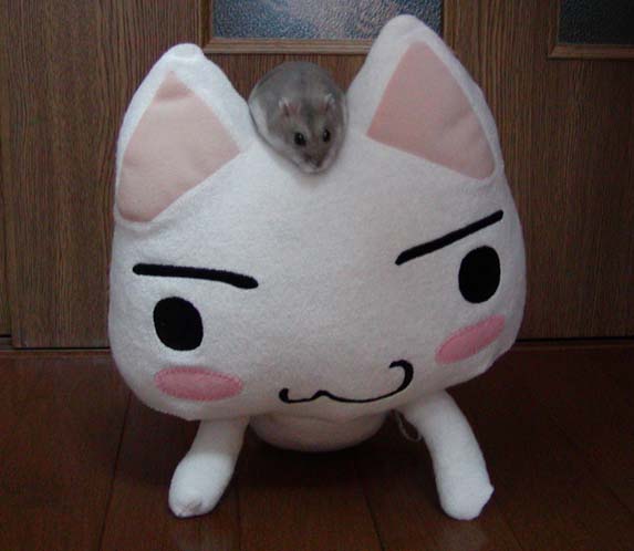 うちで飼っているジャンガリアン・ブルーサファイアの姫なのにゃ。 トロとも仲良しなのにゃ。 ネコも怖くないって、すごいハムスターだにゃ。 呼べば手にも乗ってくるんだって。 |