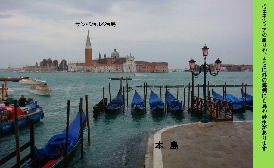 でした。周りには、遠くの砂州によってつくられた干潟(ラグーナ)の中に多くの島があります。本島には豪華客船が
