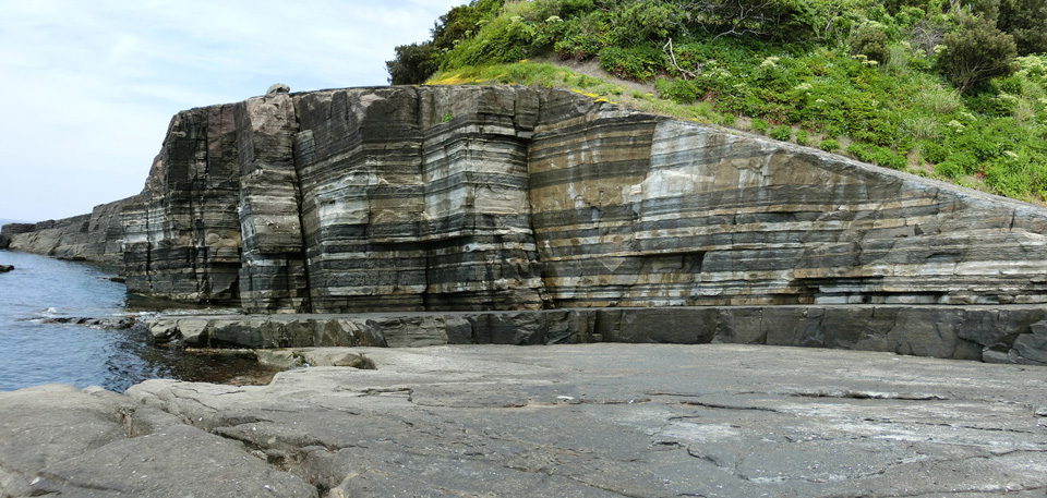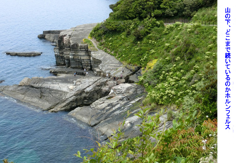海底に堆積した泥岩層と砂岩層が、上がってきたマグマの熱で溶解し頁状に再結晶しました。